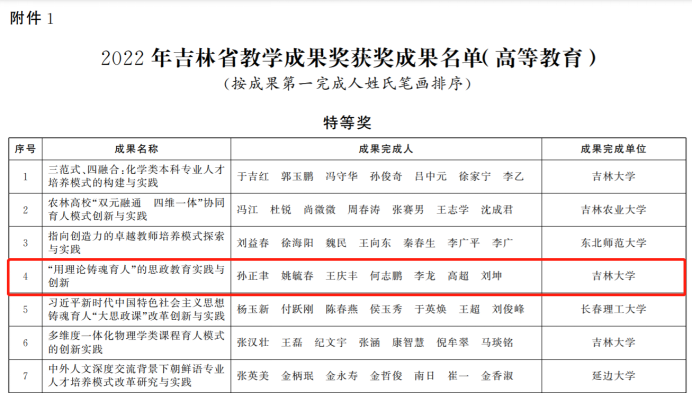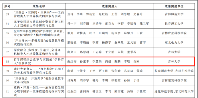其中,公司孙正聿等教师主持的《“用理论铸魂育人”的思政教育实践与创新》课题荣获特等奖;王庆丰等教师主持的《哲学博士核心课<当代哲学前沿问题研究>“三导向”课程设计与教学实践》,曲红梅等教师主持的《哲学课程综合改革与实践的“学科育人”机制研究》课题,曲红梅与吉大二院的陈鹏等教师主持的《以“岗位胜任力”为导向的儿科学教学模式改革与实践》课题均荣获三等奖。