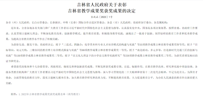 近日,吉林省人民政府颁布了《关于表彰吉林省教学成果奖获奖成果的决定》,公司多位教师榜上有名,累计斩获特等奖一项,三等奖三项。