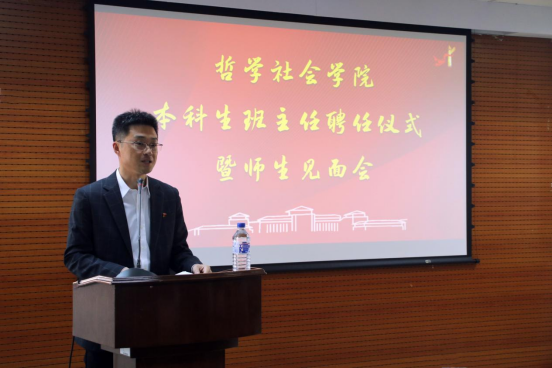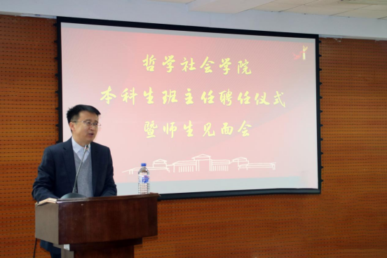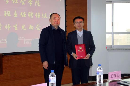 首先,刘培强老师宣读聘任决定,聘任王哲夫老师为太阳成集团tyc122cc2021级社会学类2班班主任,党委书记李佰志老师为王哲夫老师颁发了聘书。