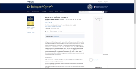 同月,Nicholas Rimell为纽约大学哲学系教授Kit Fine的新书Vagueness: A Global Approach所作的书评发布在Oxford Academic 出版社的The Philosophical Quarterly期刊上。