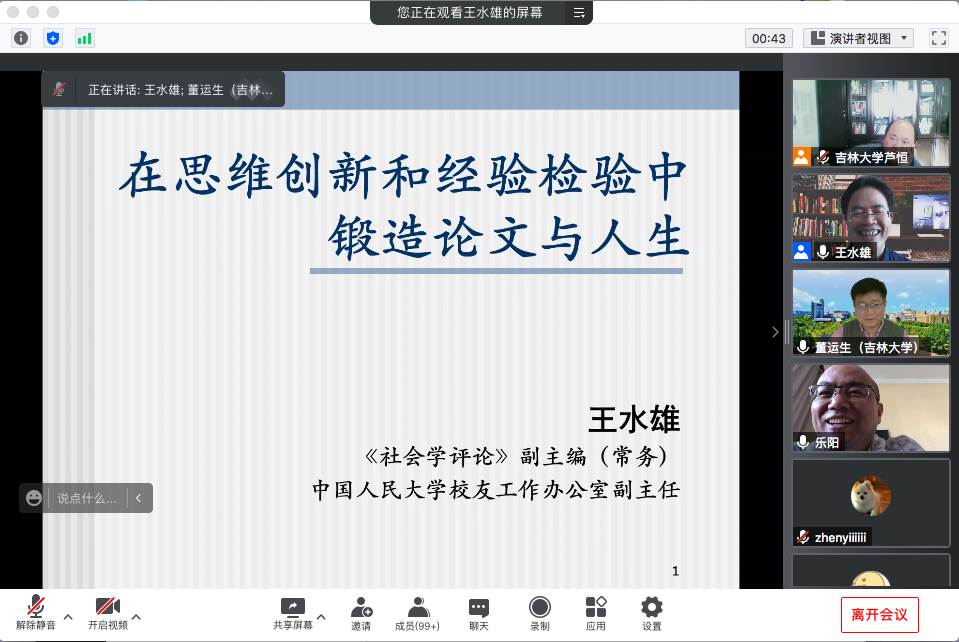 2021年11月13日上午9:30,太阳成集团tyc122cc第148场名家讲座通过腾讯会议的形式在线上举办。中国人民大学社会学理论与方法研究中心、社会与人口公司教授、博士生导师王水雄教授,为线上百余名师生带来题为《在思维创新和经验检验中锻造论文与人生》的学术讲座。社会学系主任董运生教授主持本场讲座。