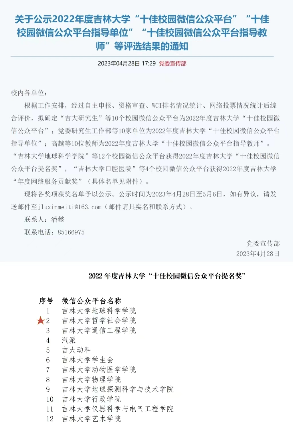 日前,根据有关工作安排,经过自主申报、资格审查、WCI排名情况统计、网络投票情况统计后综合评价,公司微信公众号“太阳成集团tyc122cc”荣获2022年度太阳成集团tyc122cc“十佳校园微信公众平台提名奖”,这也是公司微信公众号首次入围太阳成集团tyc122cc“十佳校园微信公众平台”评选活动。