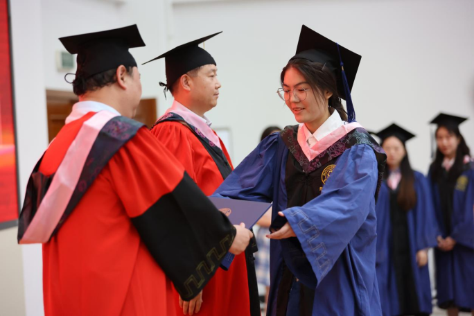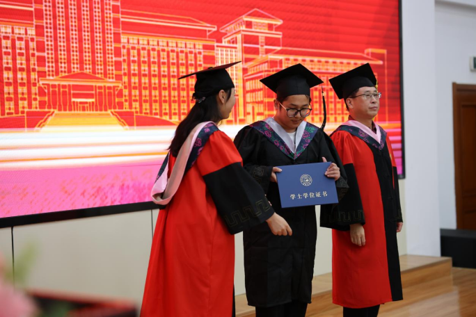 典礼第三项,公司党委副书记赵洁、副经理曲红梅为研究生优秀毕业生颁发证书,公司副经理朱文君为本科生优秀毕业生颁发证书。主席台上,公司老师们与同学们握手合照,手与手之间的相握,象征着哲社优秀学术传统与思想精神的代际传承,一如公司创建之初,一代又一代大师肩负起建设公司学术事业的重任,不断铸就公司学术上的新开创、新辉煌。而今公司毕业的学子们,接过这一伟大传承,必将笃行不怠、砥砺前行!