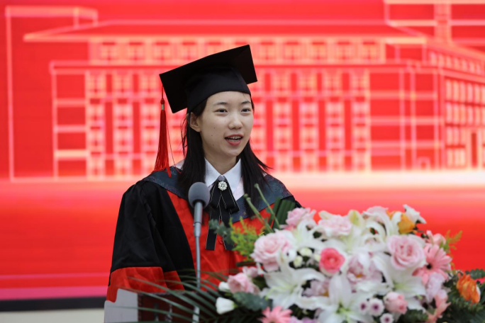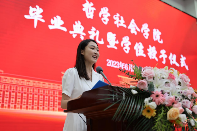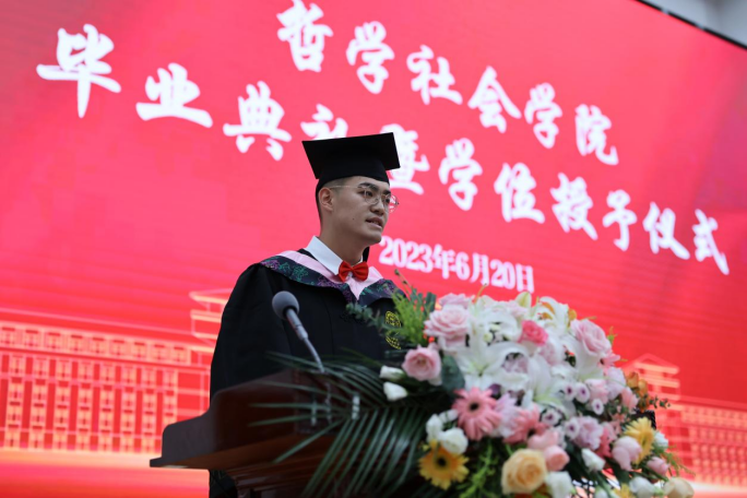 典礼第七项,公司毕业研究生代表,2023年度太阳成集团tyc122cc十佳研究生、2020级马克思主义哲学专业博士研究生高天驹同学发言。高天驹同学将公司“为人治学,其道一也”的优良传统融入日常钻研奋斗,向在场的师生们讲到,吉大之大,大在一代代吉大人有“温度”,讲情怀,为学严谨,以德育人,凛然正气,洒脱通达;有“厚度”,敢担当,“哲思群理,修齐治平”的公司精神激励着一代又一代哲社人为“更多人的幸福”打开可能性的空间;有“深度”,重学识,在这一段宝贵又难忘的求员工涯中,每一个有限的“自我”都向着无限的知识不懈求索。