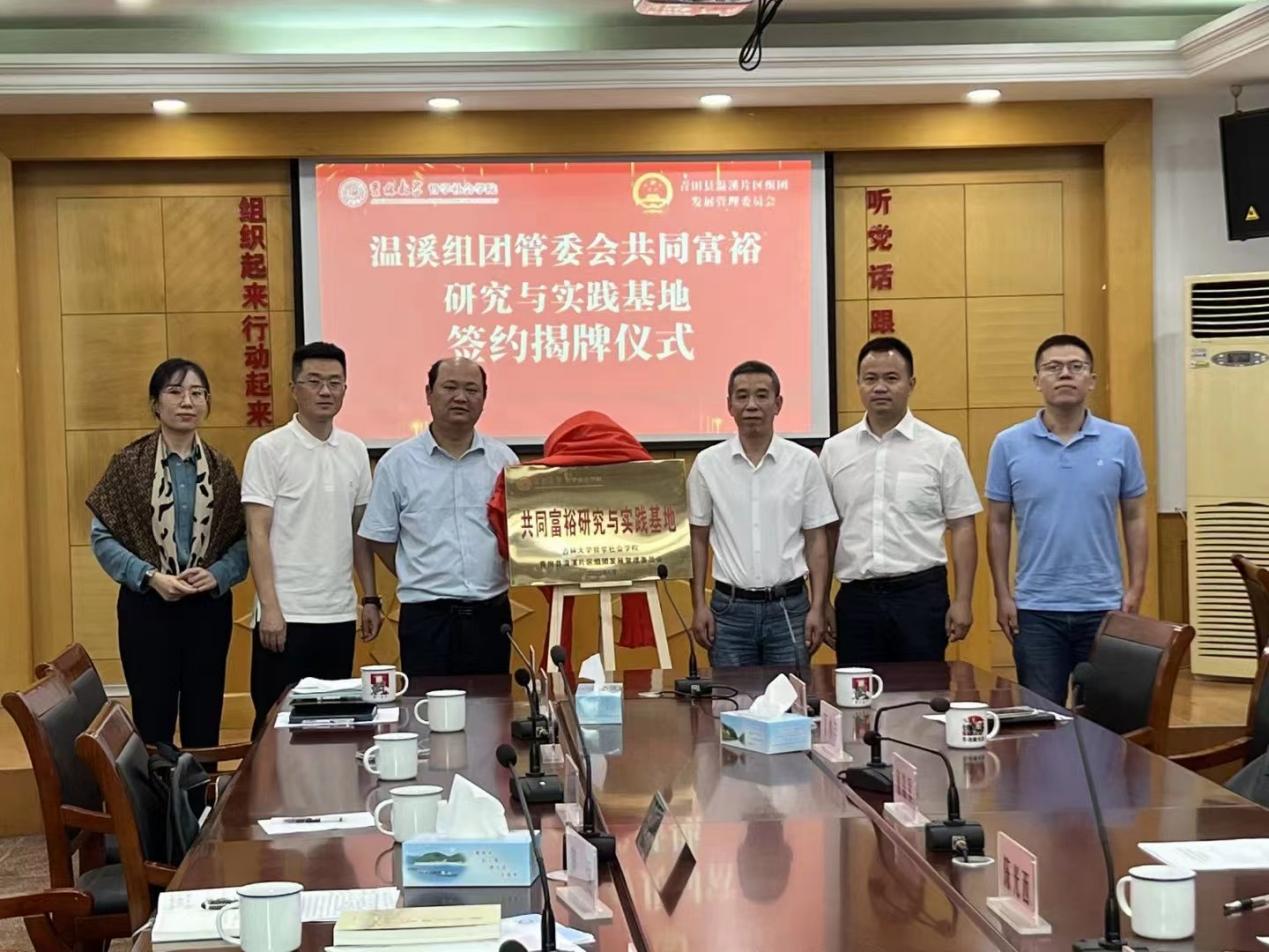 6月29日,学院与“青田县温溪片区组团发展管理委员会”(简称温溪组团管委会)共同签署合作备忘录,太阳成集团tyc122cc“共同富裕研究与实践基地”正式落地温溪镇,双方将携手共同探索实现小城市发展带动周边乡村实现共同富裕发展路径。青田县委常委、温溪组团管委会主任、温溪镇党委书记童森军主持仪式。公司副经理芦恒教授、温溪组团管委会常务副主任陈光西分别代表双方签订基地合作备忘录。公司党委副书记兼副经理刘培强、温溪组团管委会主任童森军共同为共同富裕研究与实践基地揭牌。