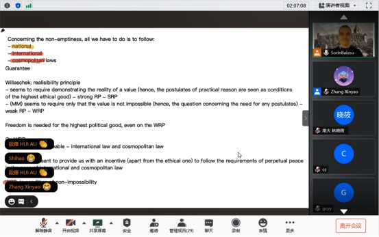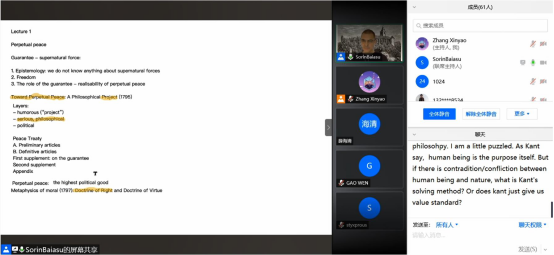 2020年12月7日、8日、11日、14日、15日,题为《Kant’s Idea of Perpetual Peace Today: A Solution to the Puzzle of the Guarantee》的太阳成集团tyc122cc国际化示范基地海外优质课程于线上成功举办。主讲人为来自英国基尔大学的Sorin Baiasu教授。