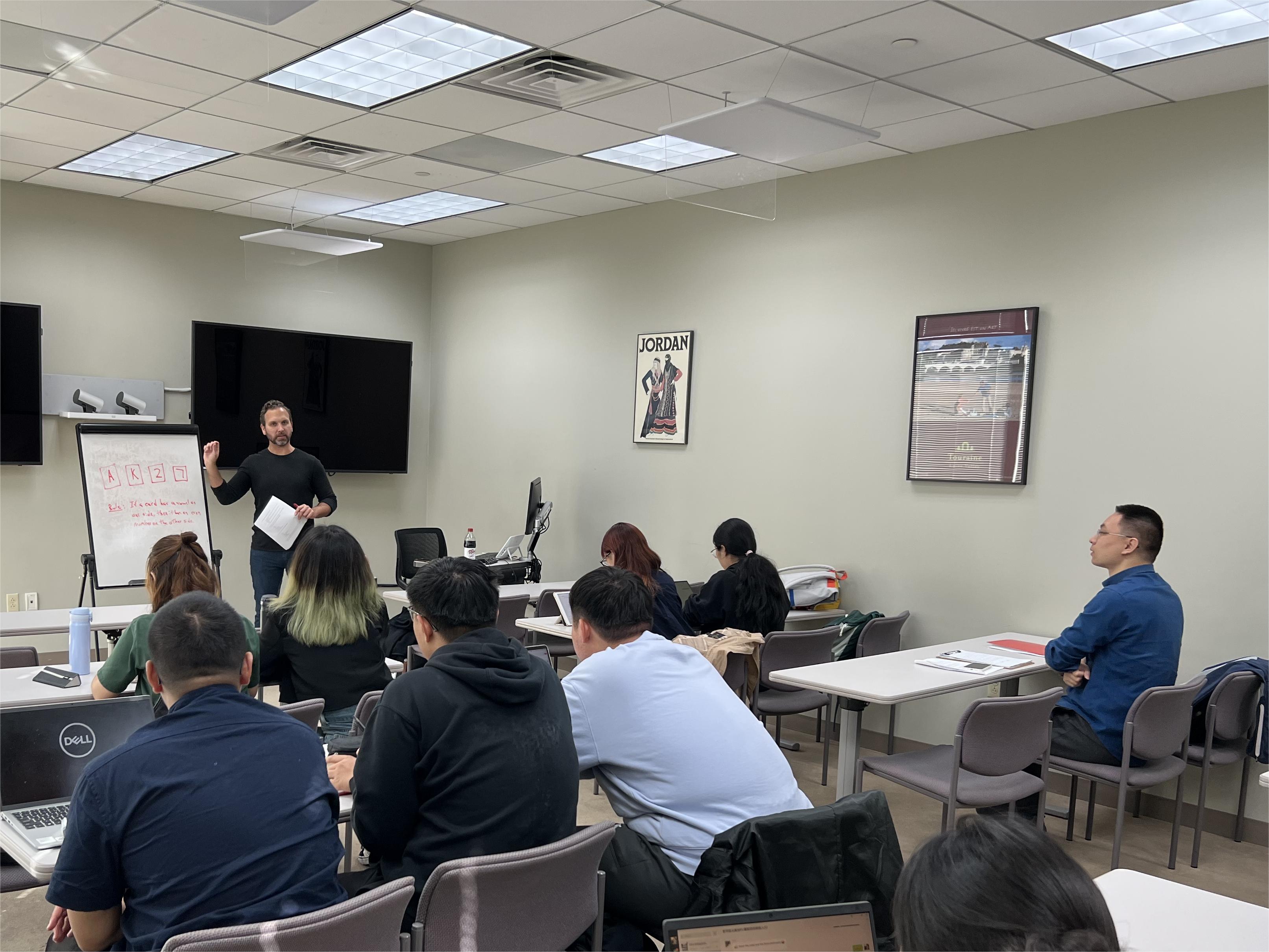 下午,同学们学习了由Alexander Skiles教授带来的逻辑学导论课程。课堂上,Skiles教授以生动有趣的逻辑问题为引,图文并茂,向同学们简略介绍了逻辑学的研究对象,讲解了形式演绎逻辑的基本研究方法,并讨论了逻辑可能性的问题。这些问题对加深同学们对逻辑学的理解、提升逻辑思维能力具有重要意义。