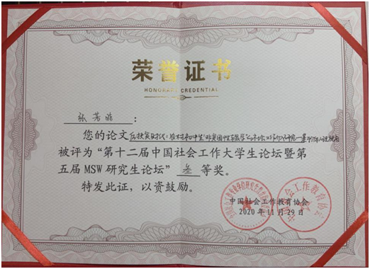 近日,由全国社会工作专业学位研究生教育指导委员会、中国社会工作教育协会联合主办,江西财经大学承办的“第十二届中国社会工作老员工论坛暨第五届研究生论坛”落下帷幕。公司2018级社会工作专业本科生张若晗荣获全国三等奖。