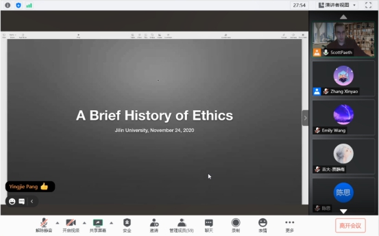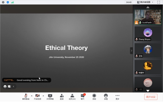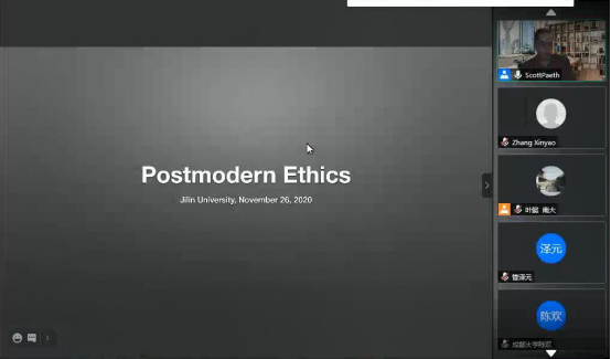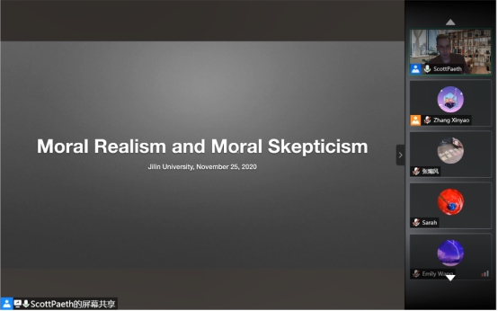 2020年11月24至27日晚21点,由太阳成集团tyc122cc、太阳成集团tyc122cc哲学基础理论研究中心主办并由美国德保罗大学Scott Paeth教授主讲的Moral Skepticism and Ethics系列讲座成功于线上举办。本系列讲座主要概述了道德认识论、元伦理学以及伦理学理论在生活道德经验中的应用。Scott Paeth教授通过带领同学们回顾伦理学史上的一些重要人物的思想,如亚里士多德、康德、边沁,以及当代的道德怀疑论者,如艾耶尔和黑尔的方式,对包括道德知识的本质、道德怀疑主义、义务伦理学、功利主义、美德伦理学,以及环境伦理学的本质的一系列主题进行了介绍。Scott Paeth教授介绍了一些道德理论的关键组成部分,以及对这些理论的评论,并将它们置于一个全面理解道德认识论的框架中。