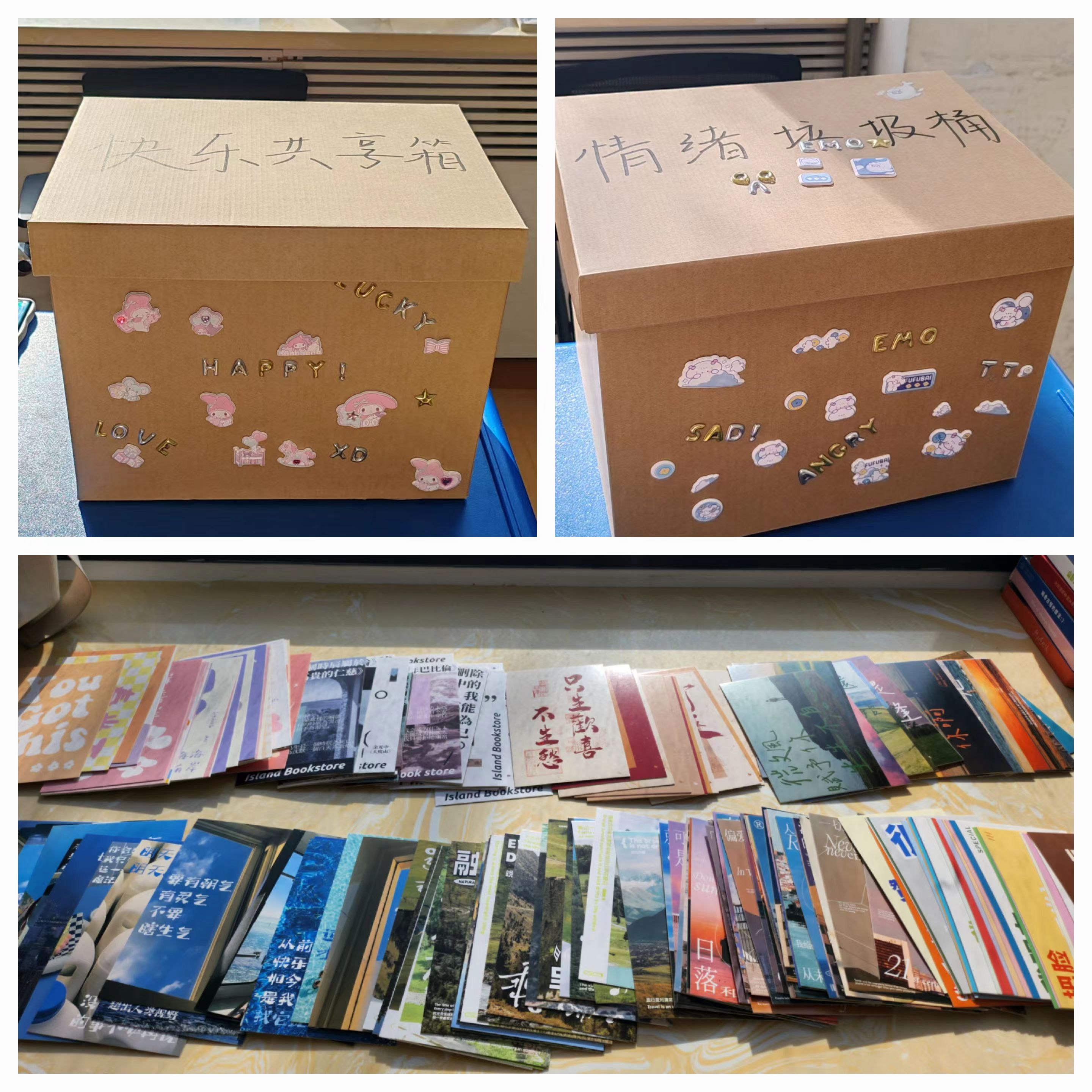 本次活动分三个阶段开展。首先是“快乐共享箱”和“情绪垃圾桶”环节,同学们写下自己的快乐趣事,投入“快乐共享箱”中,同时抽取一位其他同学的快乐卡片,分享他人的喜悦,共同传递快乐情绪;此外,同学们也记录了自己的烦恼困惑,投入“情绪垃圾桶”,倾诉自己的“忧心事”,寻找情绪波动的原因,更加了解自己,并学习如何宣泄释放负面情绪,为自己找寻释放压力的正确渠道,增强了同学们的心理韧性。
