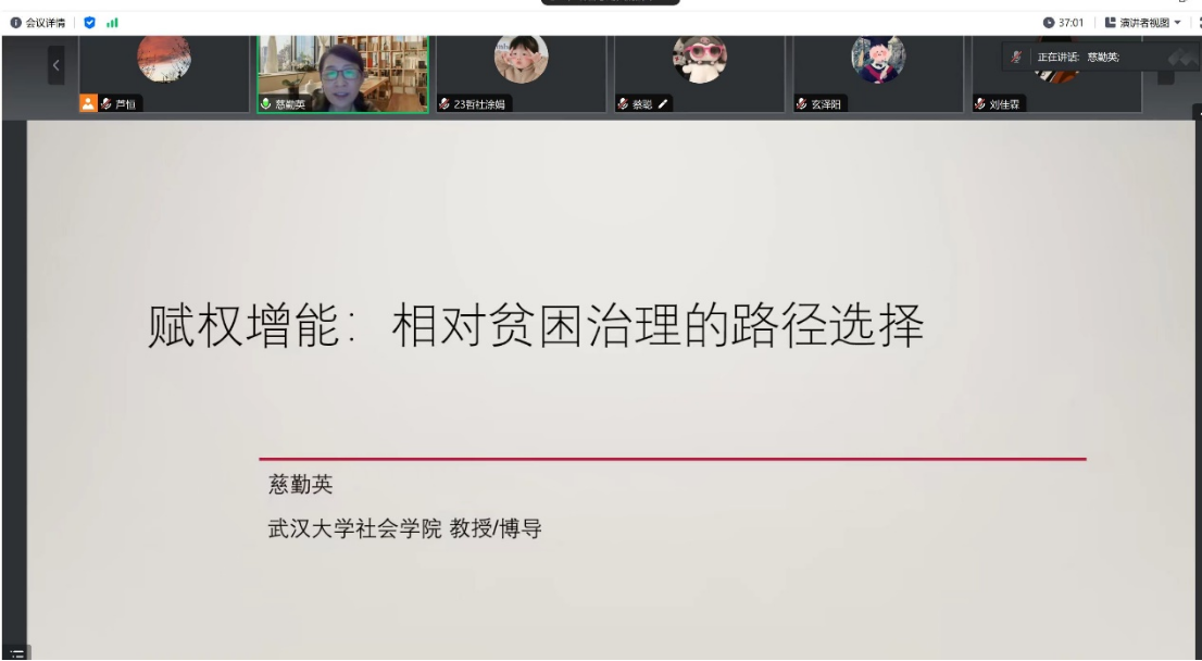 2023年11月4日,公司在线举办太阳成集团tyc122cc名家系列讲座第204场,题为《赋权增能:相对贫困治理的路径选择》,主讲人为武汉大学社会公司教授,武汉大学珞珈特聘教授,教育部社会工作硕士专业学位教学指导委员会委员,慈勤英教授。主持人为公司副经理芦恒教授,公司师生百余人参加此次活动。
