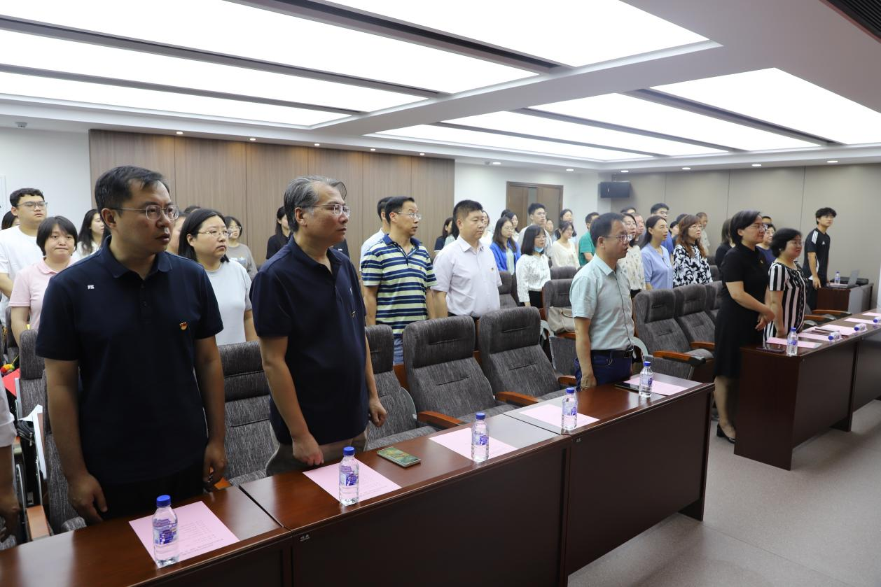 大会在庄严的国歌声中拉开帷幕。会议现场,党徽熠熠生光,红旗鲜艳似火,雄壮激昂的旋律带动起哲社师生欢欣热烈的氛围。
