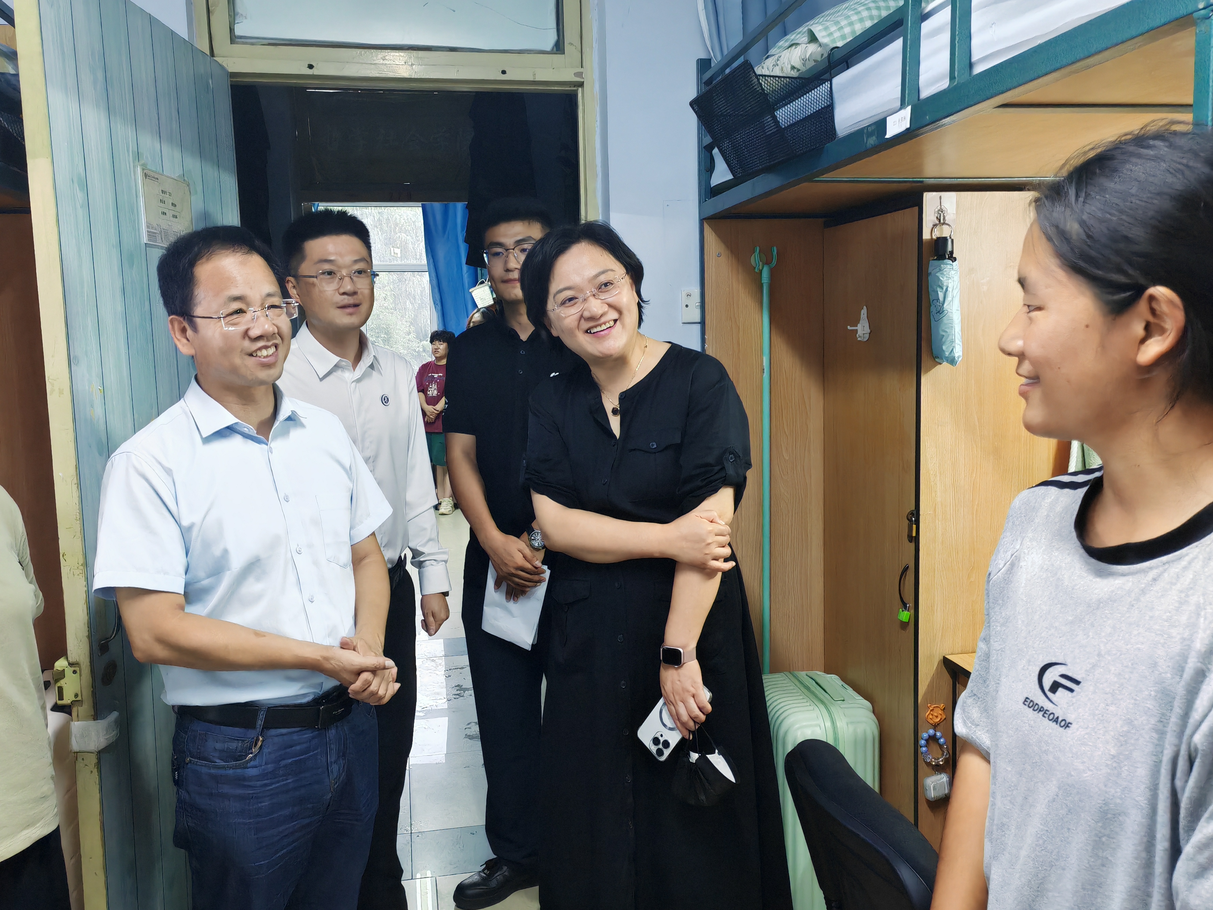 在走访交流过程中,刘培强老师带领员工工作办公室的各位老师们共同对新生寝室的各项消防安全设施以及基本设备的布置情况进行了检查,并与同学们亲切交流。