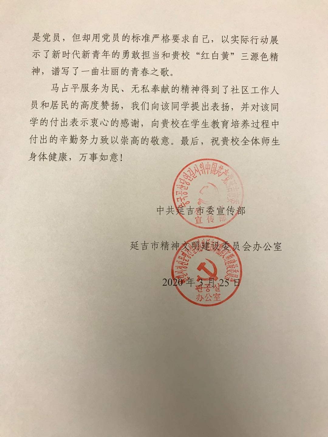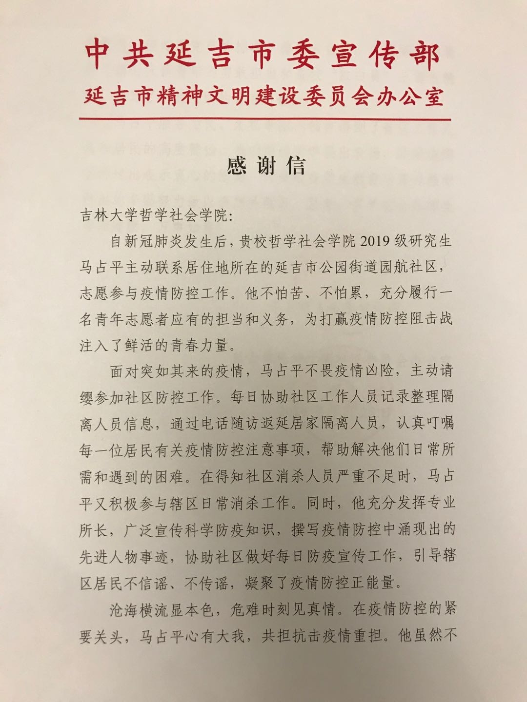 公司2019级马克思主义哲学研究生马占平主动联系居住所在地吉林省延吉市公园街道园航社区,志愿参与疫情防控工作。他不怕苦不怕累,主动参与防疫宣传、社区人员登记排查、安检消毒、心理咨询等工作,他服务为民、无私奉献的精神赢得了社区工作人员和居民的高度赞扬,以实际行动展现了吉大学子新时代新青年的勇敢担当。延吉市委宣传部、延吉市精神文明建设委员会办公室2020年3月25日向公司发来感谢信,向该同学提出表扬,对该生表示感谢,向公司在员工教育培养过程中付出的努力致以崇高的敬意。