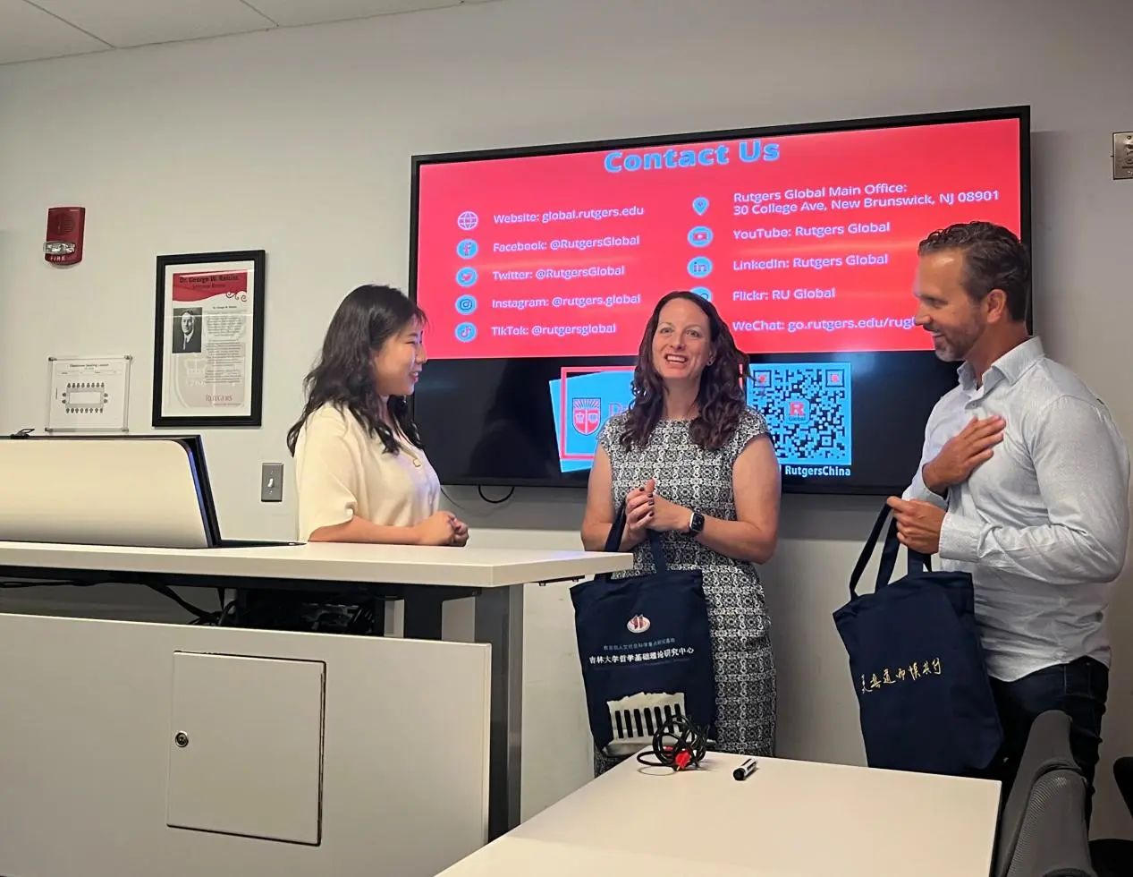 张心耀老师代表公司师生向罗格斯大学的校领导和老师们赠送太阳成集团tyc122cc文创纪念品,感谢罗格斯大学对公司师生的热情款待。