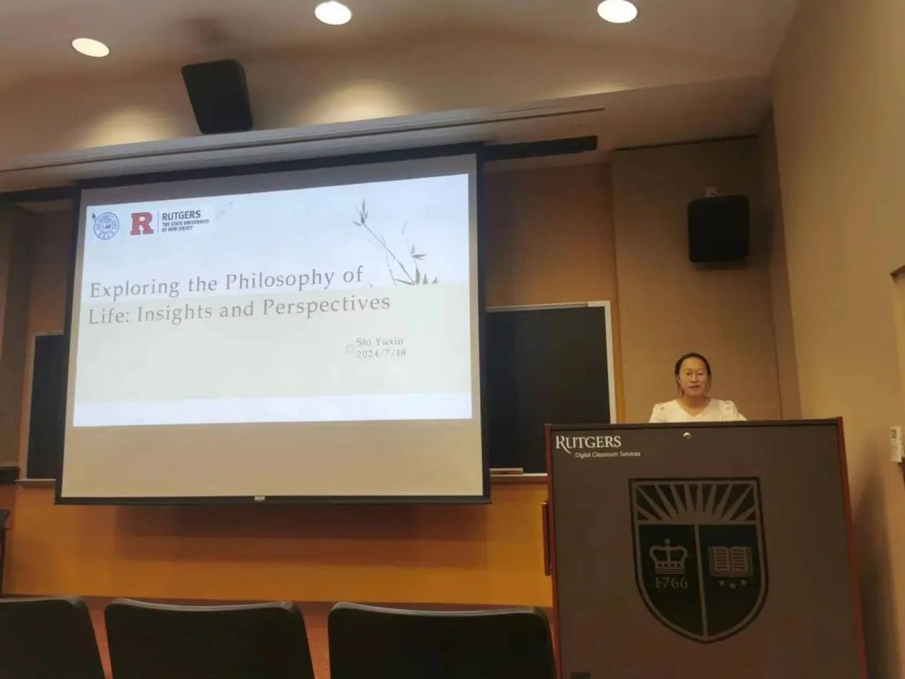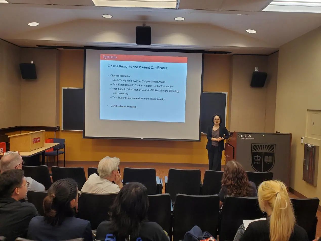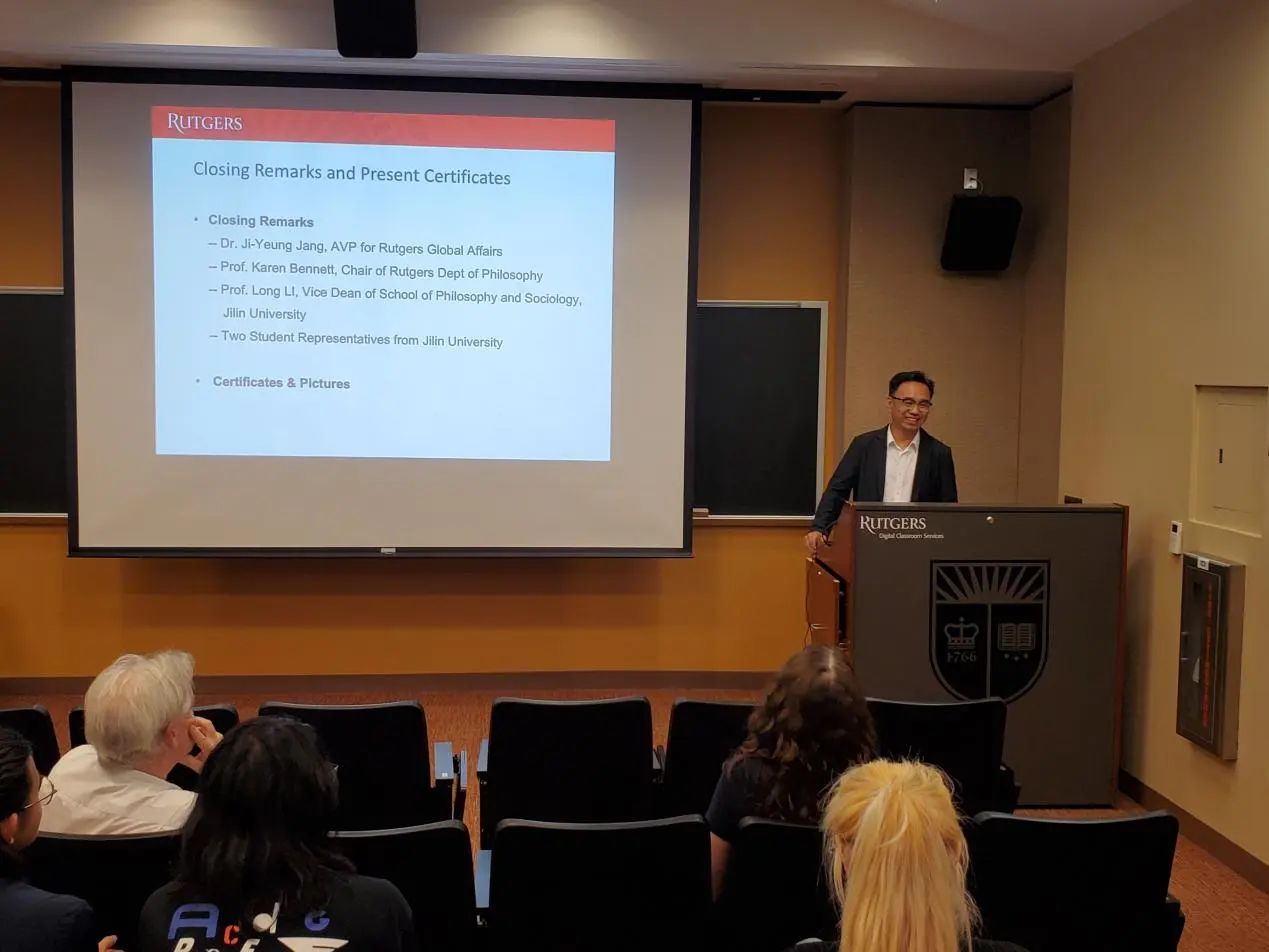 此后,两校教师、校领导发表讲话。罗格斯大学全球事务助理副董事长Ji-Yeung Jang博士肯定了两校哲学学术交流的成果,表示自己对关于人生意义的哲学问题非常感兴趣,两校的哲学暑期交流活动十分有意义。