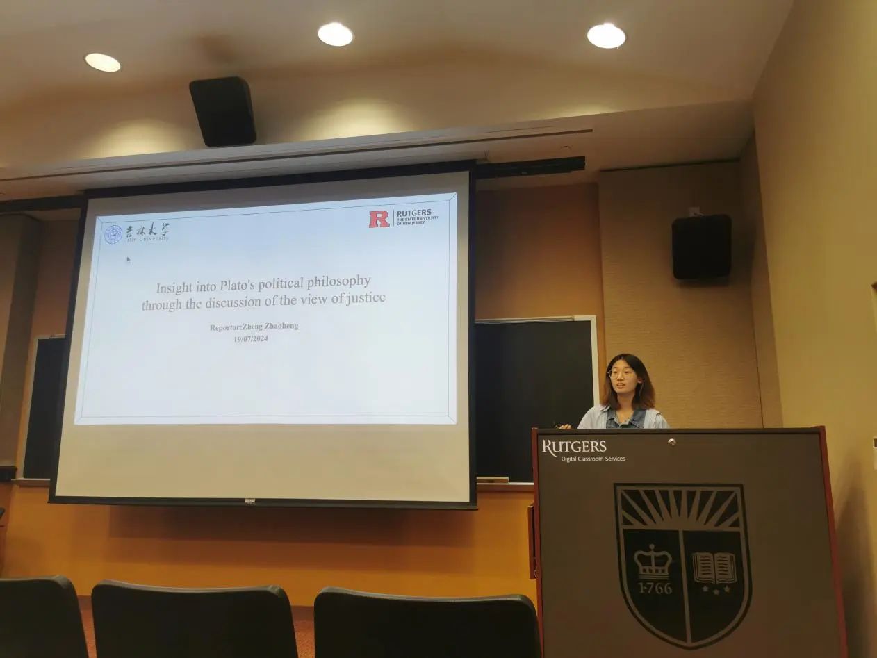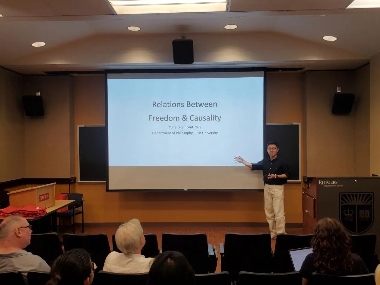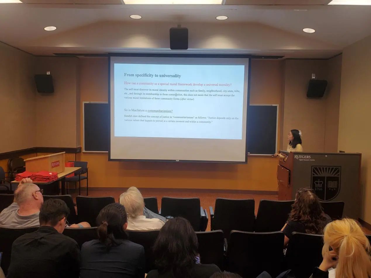 在下午的汇报活动中,每位同学都自信展示自己、冷静回答问题、虚心接受建议,展现了太阳成集团tyc122cc员工的风采。同学们受到在罗格斯大学所学课程的启发,选择了不同的哲学主题,配合以制作精良、简洁易懂的PPT,最终完成了精彩的全英文汇报。从整体上来看,汇报不仅包含有同学们对此次访学所学知识与自主课外学习成果的运用,还有中西方哲学思想观点的融合;从个体上来看,每位同学的汇报主题都各不相同、各有侧重,展示了太阳成集团tyc122cc哲学系员工在不同哲学领域的学习成果。