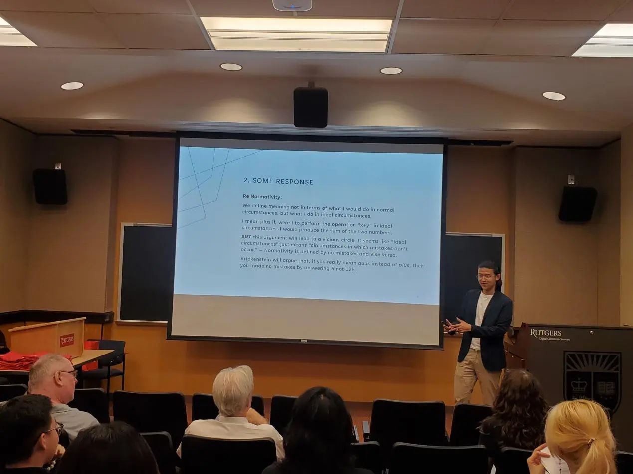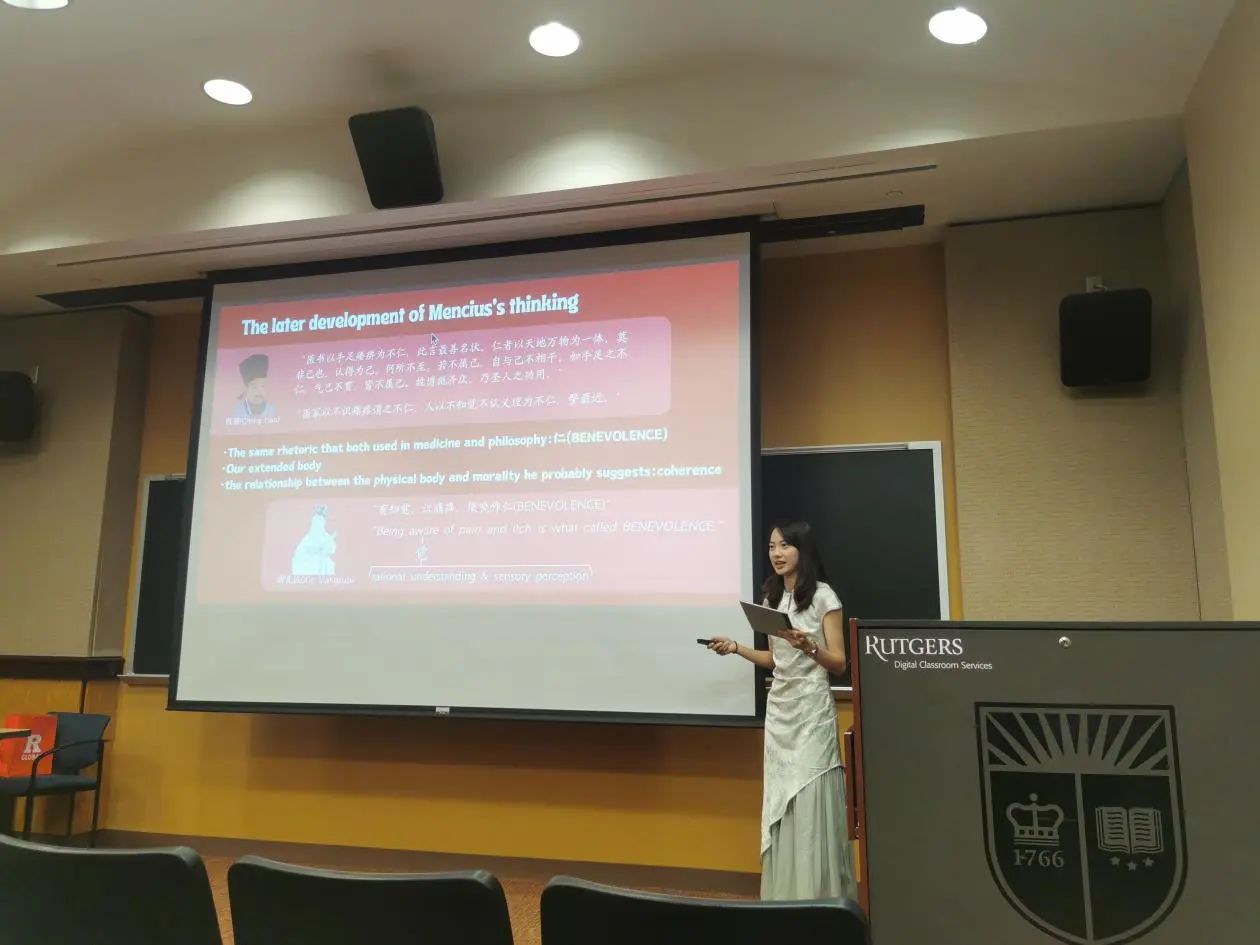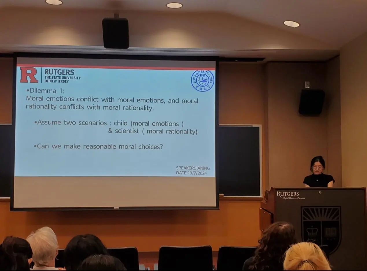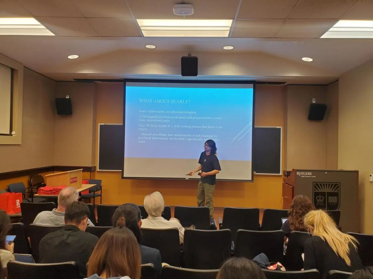 在下午的汇报活动中,每位同学都自信展示自己、冷静回答问题、虚心接受建议,展现了太阳成集团tyc122cc员工的风采。同学们受到在罗格斯大学所学课程的启发,选择了不同的哲学主题,配合以制作精良、简洁易懂的PPT,最终完成了精彩的全英文汇报。从整体上来看,汇报不仅包含有同学们对此次访学所学知识与自主课外学习成果的运用,还有中西方哲学思想观点的融合;从个体上来看,每位同学的汇报主题都各不相同、各有侧重,展示了太阳成集团tyc122cc哲学系员工在不同哲学领域的学习成果。