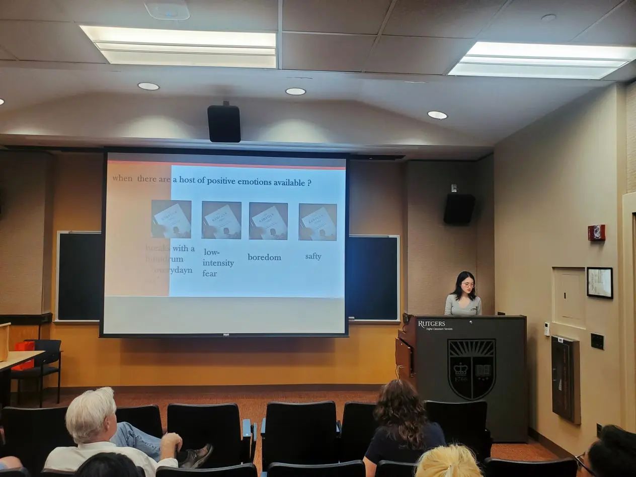 本次汇报通过对A philosophy of Fear一书中的部分内容进行解读,介绍了恐惧——特别是艺术作品中的恐惧——对人的吸引力。恐惧与好奇心有关,电脑游戏等直接参与的活动会更容易引起人的恐惧。这形成了一种悖论。在现实生活中,人会远离恐惧源,然而人在面对恐怖的艺术作品时,有时却自愿寻求恐惧体验,因为这些体验满足了人的情感需求,让其感到自己是活生生的人,而非死物。显然恐惧也是情感体验。另一方面,当我们的生活充满积极情绪,情感需求得到满足时,我们为何仍旧寻求恐惧?一是人有体验完整的情感的需求,这样的生活才是真实的;二是日常生活中的恐惧大多属于“Low-intensity Fear”,不会让人获得巨大的恐惧体验,而艺术作品中获取的这些生活中无法见到的恐惧源往往能引起强烈的情感波动;三是恐惧能够打破单调生活的乏味;四是从艺术作品中获取的恐惧并不会真的伤害到现实中的人。总的来说,这一汇报从人追求恐惧的原因、人的情感需要、人从日常生活与艺术作品中所获取的恐惧情绪的差异以及引起恐惧情绪的艺术作品的安全性等多个方面阐释了恐惧对于人的特殊吸引力。