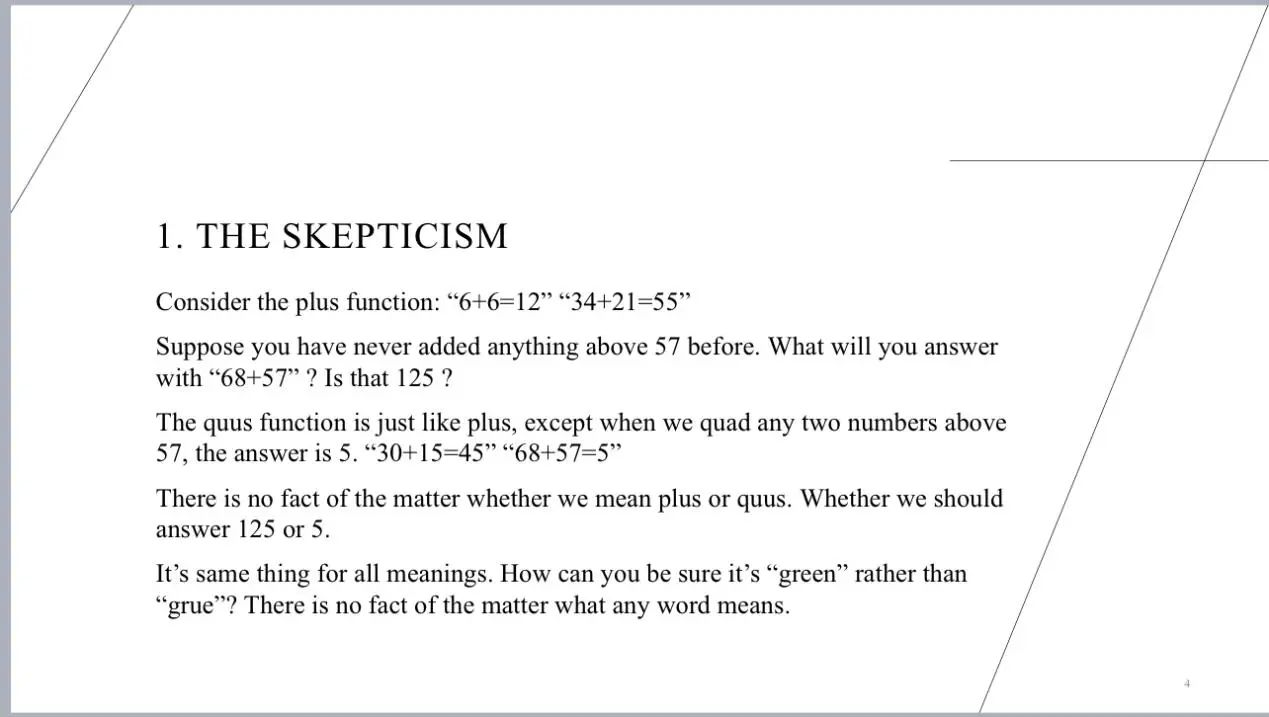 克里普克斯坦的怀疑主义(Skepticism of Kripkenstein)是克里普克对维特根斯坦私人语言论证的再诠释,它是针对一切含义(Meaning)的怀疑,试图指出含义本身的根本不确定性。典型的例子包括对加法规则的怀疑等。目前针对该怀疑主义的几种反驳方式,如操作主义(Operationalism)反驳或规范性(Re Normativity)反驳等,都无法有效避免怀疑主义。但我们依然可以通过怀疑论式的(Skeptical)和直接式的(Straight)两种方式来给该问题做出解答(Solution),前者承认含义的不确定性并试图通过实用主义的方式恢复其合法性,而后者则试图通过简单性(Simplicity)原则来确定含义。