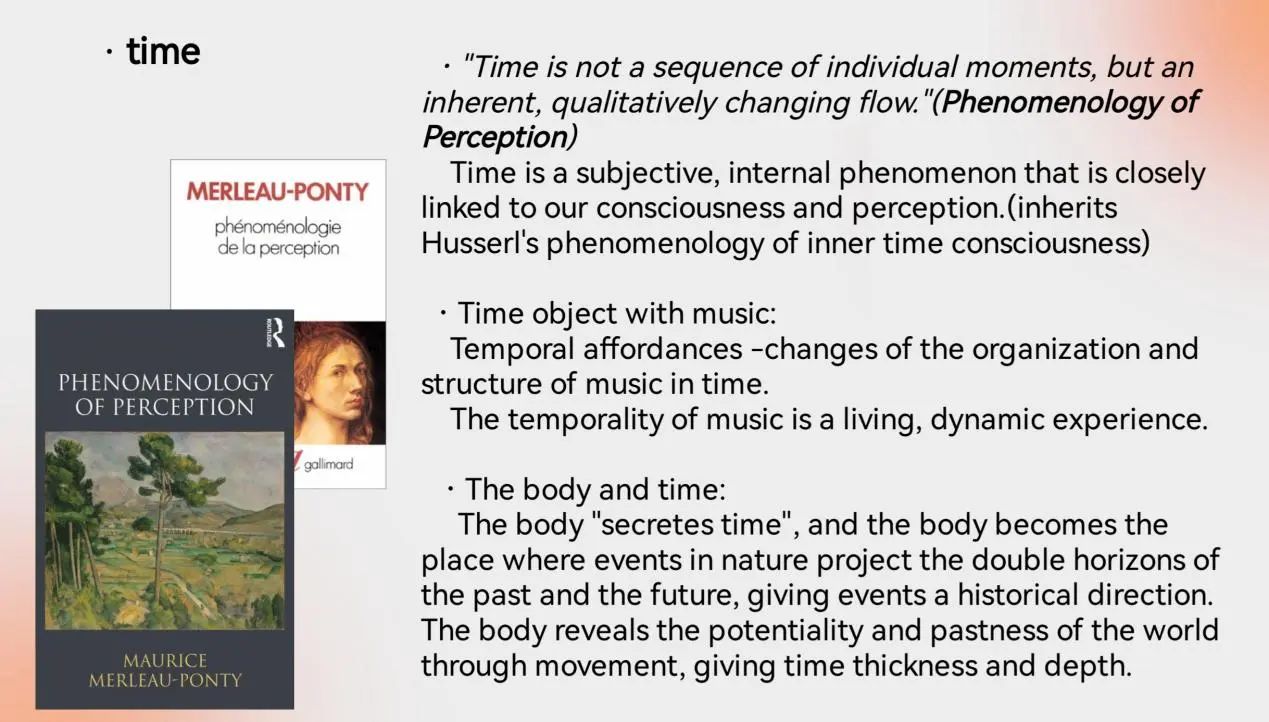 本次汇报以《音乐、身体知觉与时间意识》(Music, Body Perception and Time Awareness)为探讨主题。音乐作为一种时间的艺术已经被大家公认,但因此关注音乐作为一种符号形式实现表达,常常忽略了人如何通过“身体”的感受达到对音乐符号的时间性展开的认识。这里,我们基于梅洛-庞蒂知觉现象学等内容,分析身体体验在时间生成与音乐理解中如何发挥作用,使音乐与人发生关系并成为既有意义而又不可言喻之物。