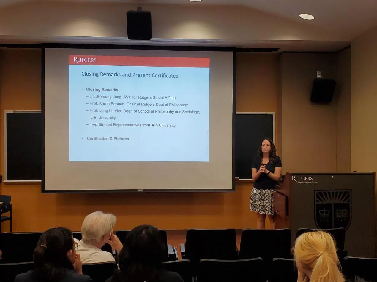 罗格斯大学哲学系系主任Karen Bennett教授和哲学系的Michael Glanzberg教授、Trip McCrossin教授对同学们的结业展示进行了点评与提问,并提出建议。三位教授都对同学们的表现给予了肯定与赞许,表示同学们的表现超乎了预期。接着,两校师生在轻松愉快的氛围下共同观看了由罗格斯大学国际处制作的“Jilin Meets Rutgers”哲学暑期公司的总结视频。