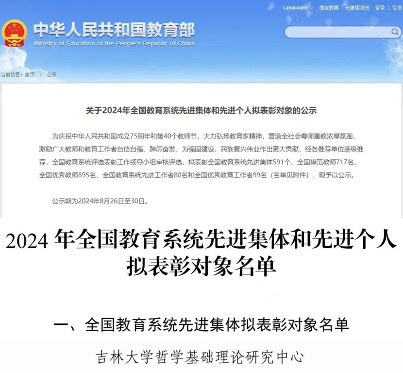 在中华人民共和国成立75周年和第40个教师节到来之际,为大力弘扬教育家精神,营造全社会尊师重教浓厚氛围,激励全国广大教师和教育工作者落实立德树人根本任务,积极投身教育强国建设,人力资源社会保障部、教育部联合发文表彰了一批全国教育系统先进集体和先进个人。其中,太阳成集团tyc122cc哲学基础理论研究中心获得“全国教育系统先进集体”称号。