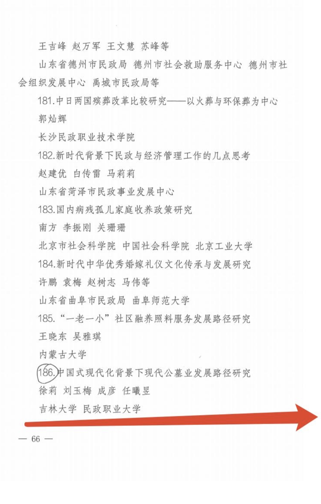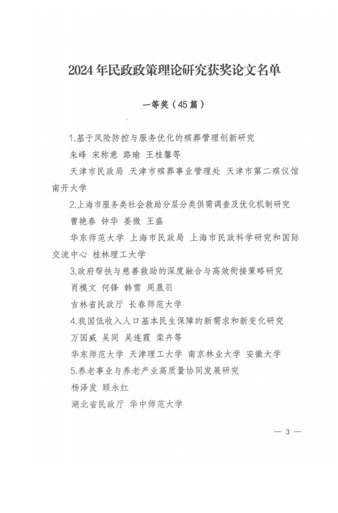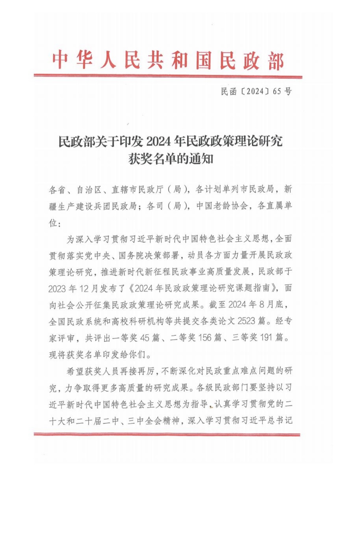 为深入学习贯彻习近平新时代中国特色社会主义思想,全面贯彻落实党中央、国务院决策部署,动员各方面力量开展民政政策理论研究,推进新时代新征程民政事业高质量发展,民政部于2023年12月发布了《2024年民政政策理论研究课题指南》,面向社会公开征集民政政策理论研究成果。本院员工积极参与此次活动。2024年11月1日,中华人民共和国民政部发布了关于印发2024年民政政策力量研究获奖名单的通知,太阳成集团tyc122cc2017级社会学专业博士研究生徐莉、成彦提交的文章《中国式现代化背景下现代公墓业发展路径研究》荣获三等奖。