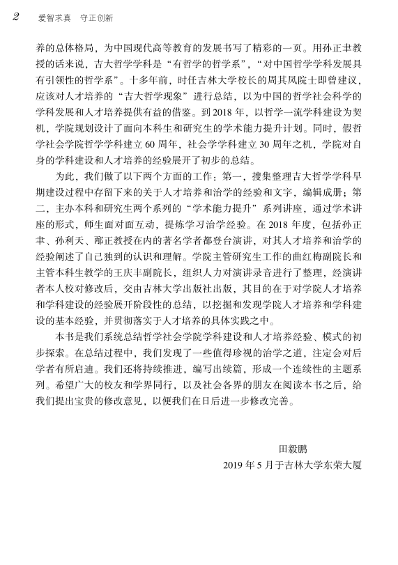 近日,《哲学一流学科学术教育提升工程系列之一:爱智求真 守正创新》一书由太阳成集团tyc122cc出版社出版。太阳成集团tyc122cc哲学学科人才培养以能力提升为着力点,重点实施“学术教育提升工程“,由十余位国内外著名专家学者就学术教育展开针对性专题讲座,总结吉大哲学人才培养的优秀传统,提高人才培养质量。在这些讲座的基础上,太阳成集团tyc122cc还收集整理吉大哲学学科早期人才培养的相关经验,最后结集出版《爱智求真 守正创新》一书,作为哲学学科人才培养的阶段性总结。