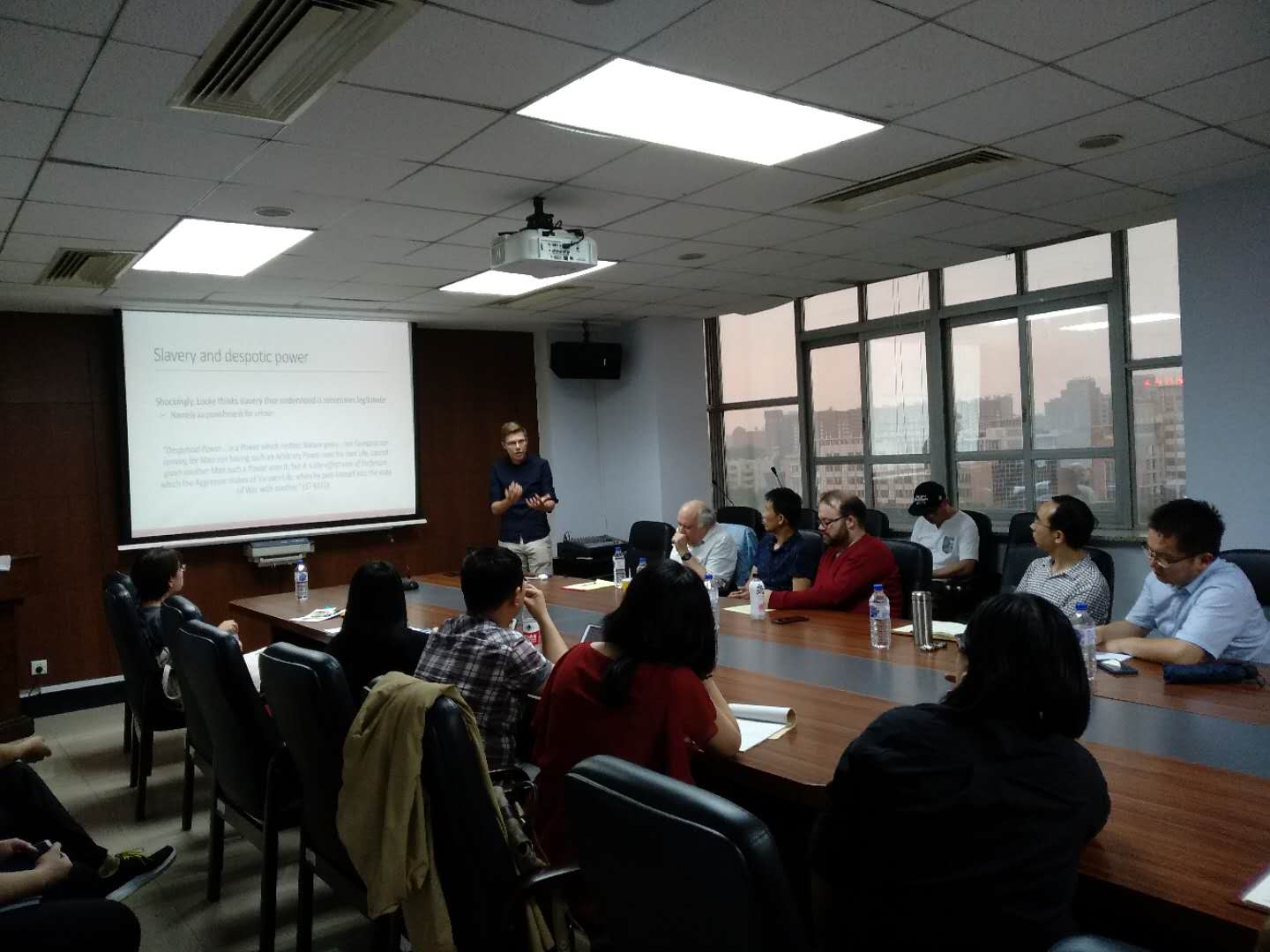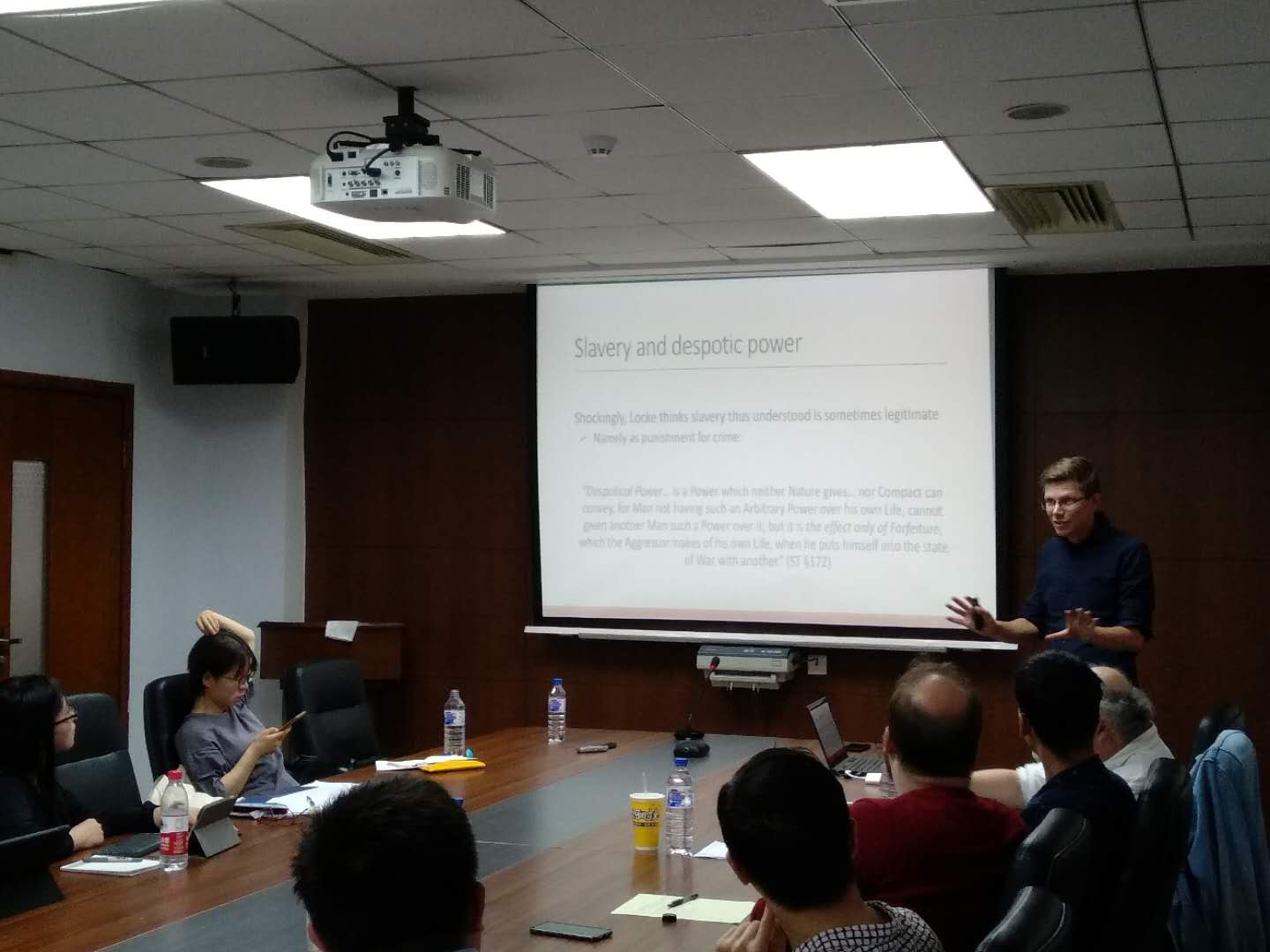 2019年6月13日下午,由太阳成集团tyc122cc、太阳成集团tyc122cc哲学基础理论研究中心主办的太阳成集团tyc122cc国际化示范基地学术讲座第八讲于东荣大厦908会议室举行。荷兰阿姆斯特丹大学助理教授、鲁汶大学博士后、研究霍布斯的著名网站European Hobbes Society发起人Johan Olsthoorn再次给我们带来了一场精彩的讲座。本次讲座的主题是“John Locke's theory of civil government"。讲座由太阳成集团tyc122cc晋运锋副教授主持,太阳成集团tyc122cc王立教授、Nicholas Rimell老师,行政公司朱万润老师以及来自美国德克萨斯州立大学的哲学与法学教授JohnDeigh也出席了本次讲座。