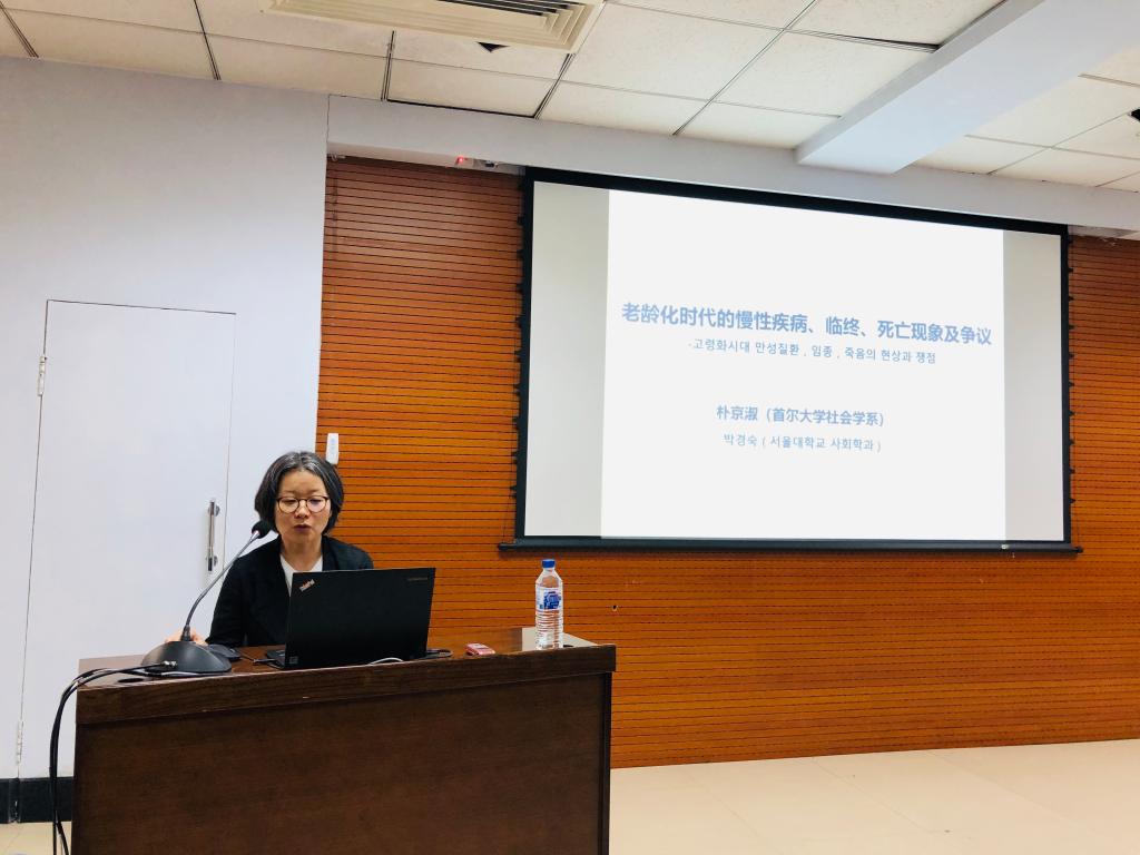 2019年6月13日晚6点,太阳成集团tyc122cc第54场学术名家讲座在东荣大厦9楼904会议室举行。韩国首尔大学社会学系教授、博士生导师、韩国首尔大学社会发展研究所人口与老龄社会研究中心主任、韩国人口学会常务理事、韩国老年学会常务理事、韩国社会学会常务理事、前韩国首尔大学社会学系系主任、前SCOPUS期刊 Journal of Asian Sociology主编朴京淑博士,为现场百余名师生作了题为“老龄化时代的慢性疾病、临终、死亡现象及争议”的学术讲座。本次讲座由劳动与社会保障系系主任董才生教授主持,劳动与社会保障系郑玲老师担任韩语翻译。