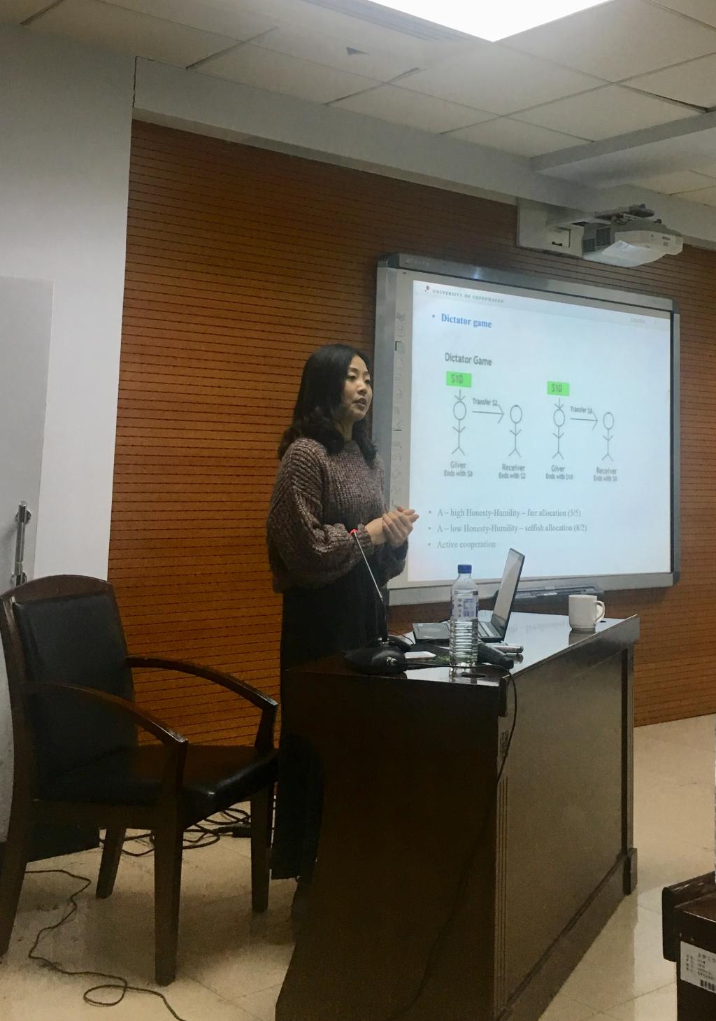 2018年12月6日晚上18:00,由太阳成集团tyc122cc主办的太阳成集团tyc122cc新锐学者系列讲座在东荣大厦9楼会议室举行。丹麦哥本哈根大学刘洁博士作了主题为“Linking the HEXACO Dimensions to Political, Organizational, and Relationship Criteria”的学术讲座。本次讲座由太阳成集团tyc122cc心理学系黄冬梅教授主持,心理学系多位教师出席了本次讲座。
