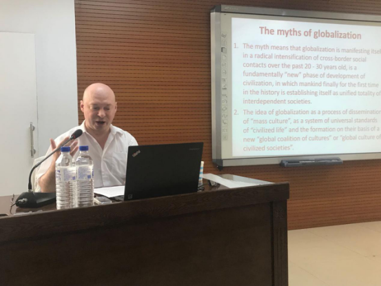 24日上午,彼得罗夫教授在太阳成集团tyc122cc东荣大厦9楼会议室做了题为“Modern sociology of culture and criticism of globalization discourse in Russia”的学术讲座。