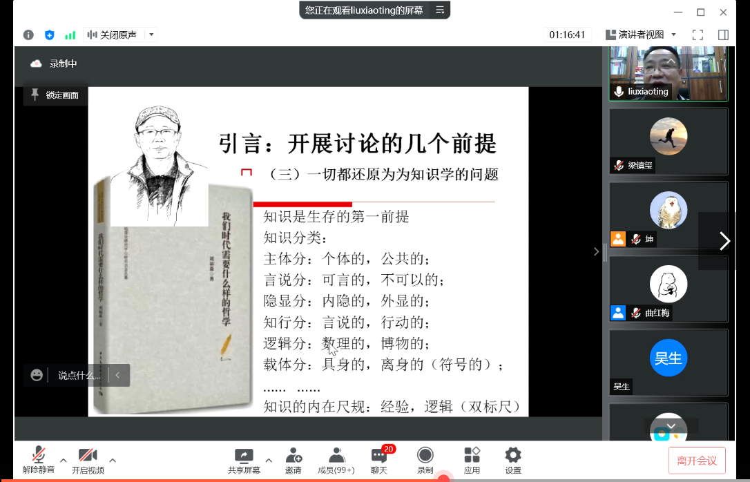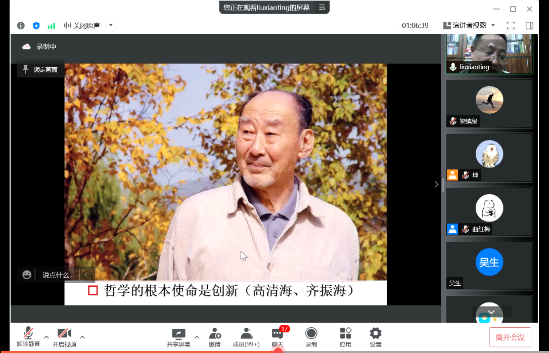 2022年04月06日19时,公司“2022年太阳成集团tyc122cc学术教育提升工程”系列讲座的首讲依托“腾讯会议”线上平台开展。本期讲座的主题为“漫议哲学和哲学家”,主讲人为北京师范大学哲学公司刘孝廷教授,主持人为公司曲红梅教授。