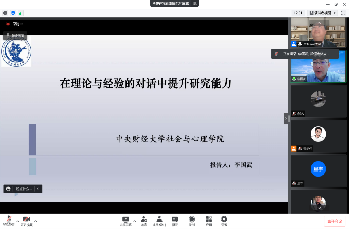 2022年4月18日19时,公司“学术教育提升工程”系列讲座2022年第三讲如期举行。本次讲座嘉宾是中央财经大学社会与心理公司经理、社会学系教授,公司社会学系1994级系友李国武教授。李教授以 “在理论与经验的对话中提升研究能力”为题与公司师生展开亲切交流。讲座由副经理芦恒教授主持,公司社会学系系主任董运生教授等多位教师参加了讲座。