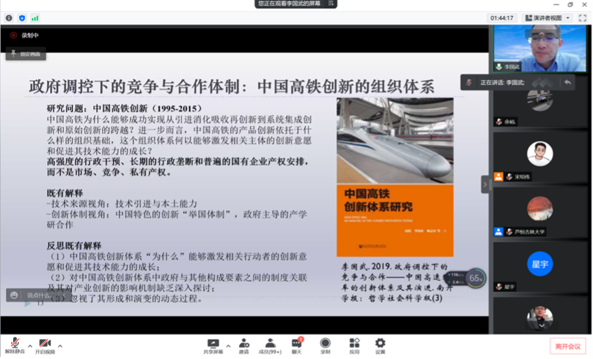 在讲座第三部分,李教授通过自己所做过的乡村特色产业集群、网络技术标准竞争、中国高铁创新的组织体系等三个社会学调查研究与参会师生进行沟通,以强调学术创作是一件很有魅力的事情,是一种从“无知”到“有知”的渐进过程,能为研究者带来崭新乐趣和体验。