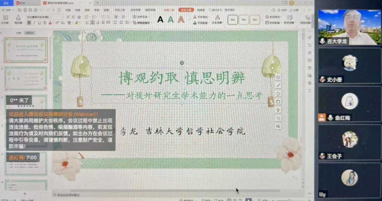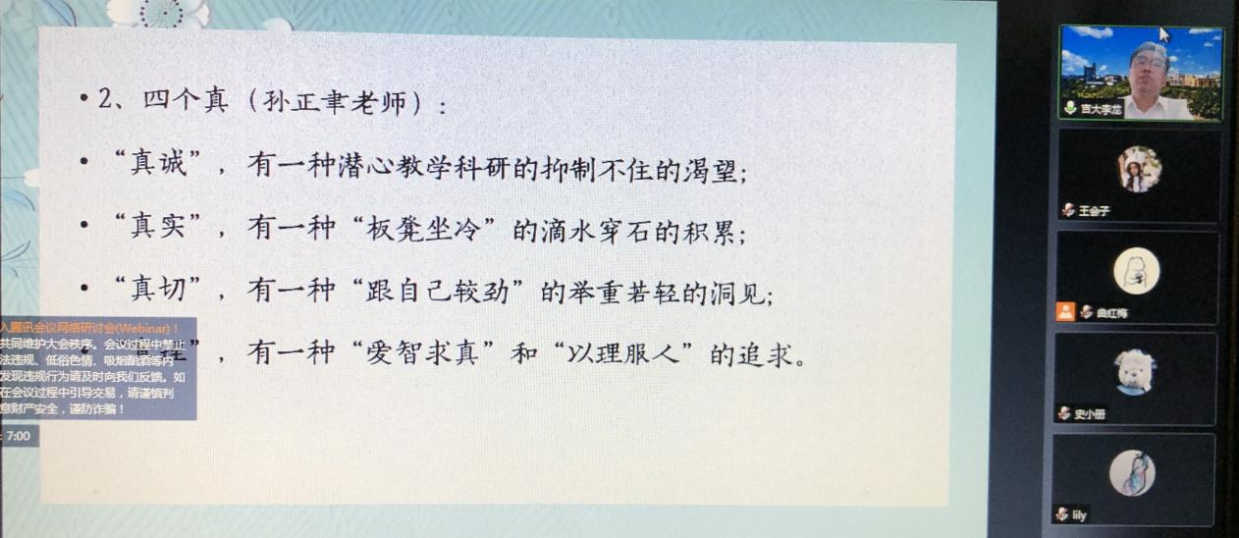 主讲结束后,李龙教授与在线师生进行了深入交流,对在线师生提出的问题做出了耐心、详细的解答。李龙教授的讲座内容充实、逻辑严谨,使师生们收获颇丰。会议最后,李龙教授对在线师生送上了两句美好寄语:一是“不要满腹经纶,却又鼠肚鸡肠”。二是“读好玩的书,做好玩的事,当好玩的人”。