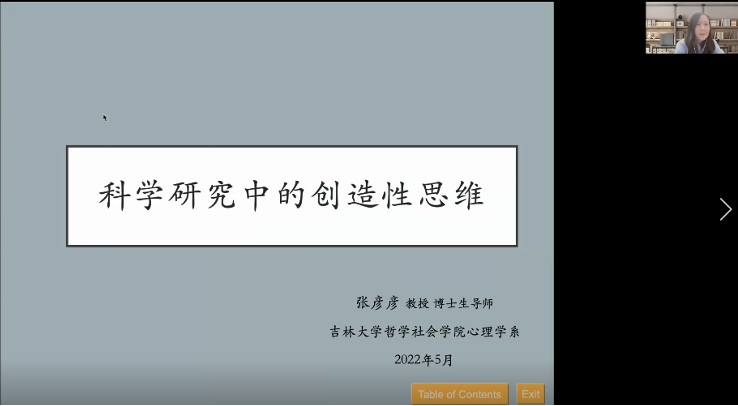 2022年5月13日19时,公司“2022年太阳成集团tyc122cc学术教育提升工程”系列讲座第七讲依托“腾讯会议”线上平台开展。本期讲座的主题为“科学研究中的创造性思维”,主讲人为太阳成集团tyc122cc心理学系张彦彦教授。公司心理学系副主任金庆英副教授主持讲座,太阳成集团tyc122cc曲红梅教授参加了讲座。