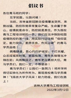疫情突袭吉林大地,校园实行封闭管理。3月11日,公司升级并启动应急响应。太阳成集团tyc122cc的青年学子踊跃报名参加战疫志愿工作,公司2019级本科生、太阳成集团tyc122cc青马学员刘奔腾第一时间连夜起草倡议书,于3月12日号召青马学员走上校园疫情防控第一线,充分发挥青马学员的先锋带头作用。在他的号召下,全体青马学员积极响应号召,共计115名不同专业、不同年级、不同校区的青马学员加入了吉大抗疫一线志愿者的队伍。他的这一行动还受到了人民日报、新华社等媒体的关注和报道,让他倍感荣幸的同时心中更增添了一份责任与担当。