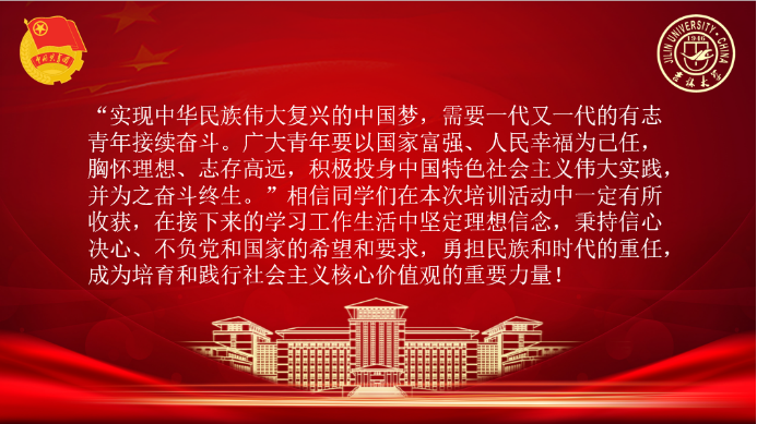 最后,主持人姚雨含同学提到,希望各位入团积极分子以国家富强、人民幸福为己任;胸怀理想、志存高远、坚定理想信念,不负党和国家的希望和要求;积极投身于中国特色社会主义伟大实践中,并为之奋斗终身!