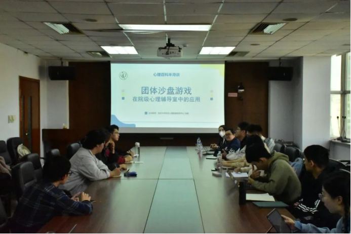 首先,汤老师以“团体沙盘游戏在院级心理辅导室中的应用”为题目,,向同学们进行了相关讲解。汤老师从沙盘游戏的起源、依托的中西方理论内涵、实操阶段的注意事项等角度为同学们进行了生动详细的讲解。汤老师提到,沙盘游戏作为体悟媒介,非语言的方式更容易直达内心,在尊重、包容的氛围里进行自我探索,有助于同学们在体验中舒解压力、调整情绪、促进成长。