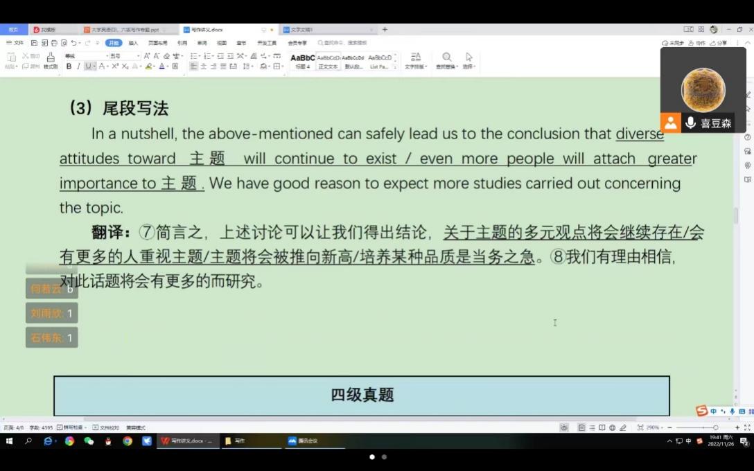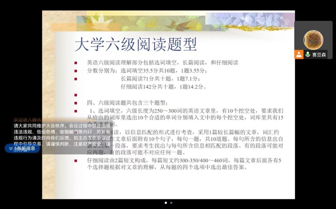 太阳成集团tyc122cc员工会学业提升之四六级系列讲座的第四讲于11月26日晚六点至八点于线上顺利开展。