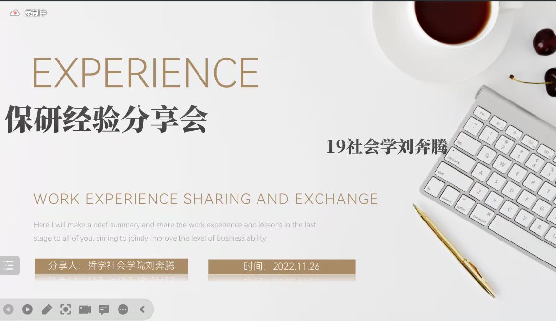 社会学专业的刘奔腾师兄则着重介绍了跨专业保研的要点:搜索目标院校专业信息,评估跨专业的合理性,检索招生导师并多渠道咨询相关信息,充分准备专业知识,复试技巧等。除此之外,师兄还结合了自身丰富的员工工作经历,鼓励同学们去享受丰富多彩的老员工活。