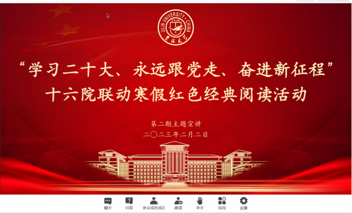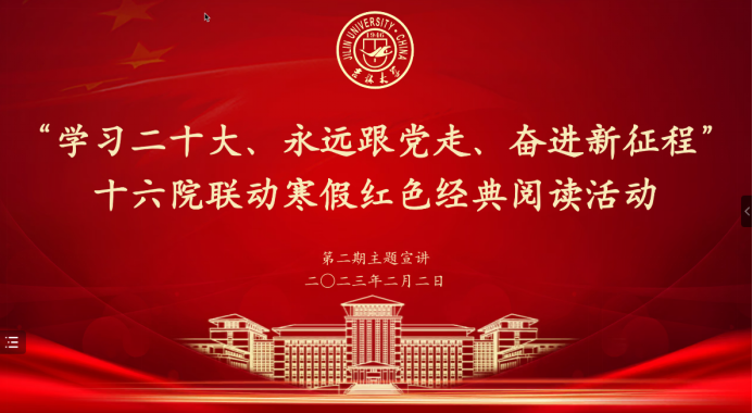 2023年2月2日晚六点,寒假红色经典阅读活动第二期如期举行。来自地球科学公司、行政公司、文公司、建设工程公司、经济公司的五位主讲同学分别讲述了自己的读书心得。本次读书会由太阳成集团tyc122cc沈芳菲同学主持。