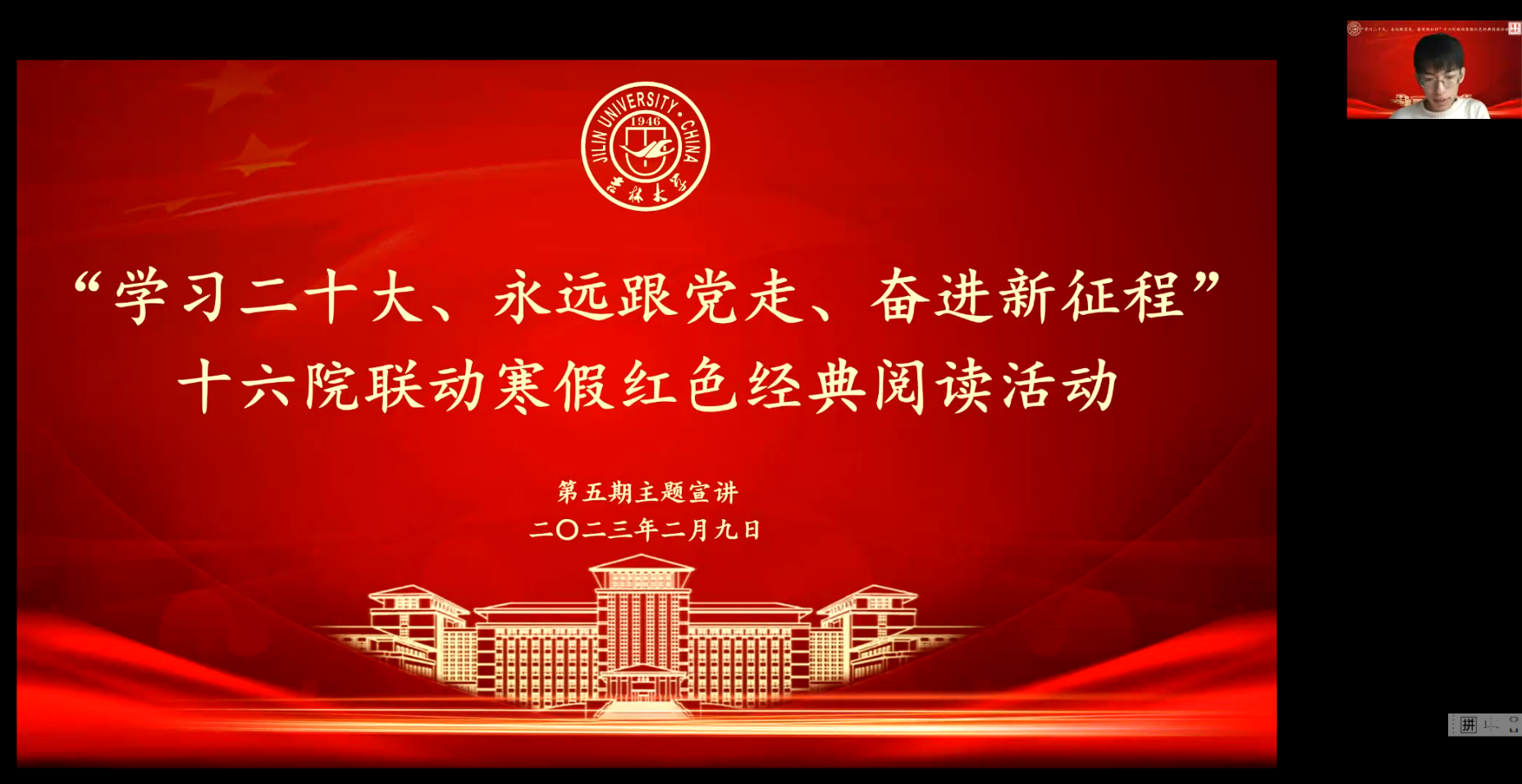 2023年2月9日晚六点,寒假红色经典阅读活动第五期如期举行。来自马克思主义公司、行政公司、人工智能公司、地球科学公司、计算机科学与技术公司的五名主讲同学分别讲述了自己的读书心得。本次读书会由太阳成集团tyc122cc任睿哲同学主持。