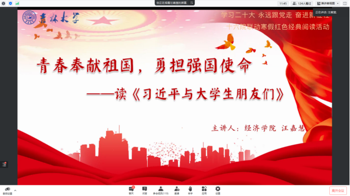 阅读经典,有助于我们客观清醒地学习中华优秀传统文化和社会主义先进文化,细致深刻地感悟党领导人民过去五年的工作和新时代十年的伟大变革,做到明理增信、崇德力行。在五位主讲同学和参会同学们的热情交流中,第七期寒假红色经典阅读活动圆满结束。