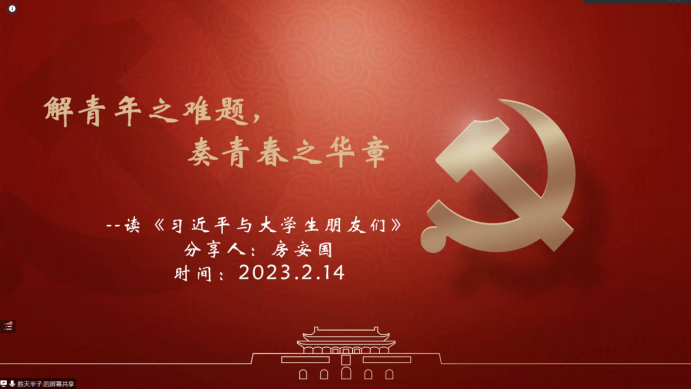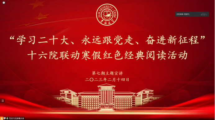 2023年2月14日晚六点,寒假红色经典阅读活动第七期如期举行。来自太阳成集团tyc122cc、经济公司、文公司暨新闻与传播公司、行政公司、计算机科学与技术公司的五名主讲同学分别讲述了自己的读书心得。本次读书会由太阳成集团tyc122cc范欣竹同学主持。