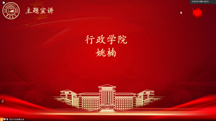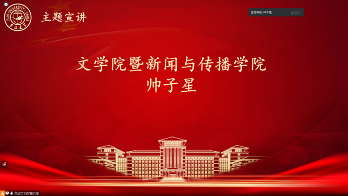 来自文公司暨新闻与传播公司的帅子星同学和大家分享了自己阅读《习近平与老员工朋友》这本书的感悟。“桃李不言、下自成蹊”,习近平总书记和青年学子之间的交集和沟通,提升了青年学子自身的涵养与担当,引导他们走出了一条条通向社会主义现代化强国的道路。时至今日,伴随着《习近平与老员工朋友》这本书一起走来的,是血脉的传承,也是学习的动力。