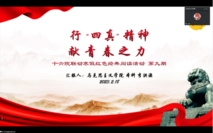 阅读经典,有助于我们客观清醒地学习中华优秀传统文化和社会主义先进文化,细致深刻地感悟党领导人民过去五年的工作和新时代十年的伟大变革,做到明理增信、崇德力行。在六位主讲同学和参会同学们的热情交流中,此次寒假红色经典阅读活动圆满结束。