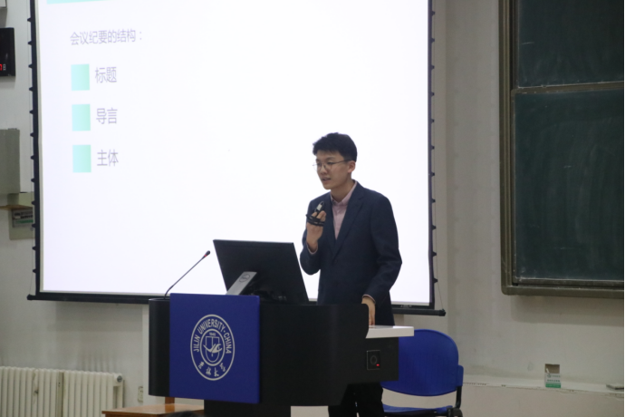 首先,团委组织部房安国同学为同学们进行了公文写作技能的培训。他讲到公文写作具有政策性、实用性、可靠性、定向性、时间性及规范性的特点。随后,他从写作的常见的三种类型,即策划案、通讯稿、会议纪要逐一展开,并结合自己经历,将具体实例贯穿在讲解之中,形象地向同学们介绍了写作的诸多方法,并希望大家在之后的写作中,牢牢把握这些特点与方法,精雕细琢、脚踏实地的完成之后的每一次写作任务。